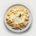 The Amazing Pasta with spicy sauce and 4 cheese topping, served with our special dippings